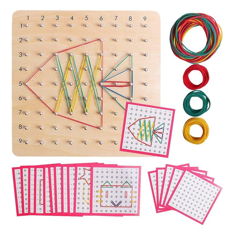 - Geometrical Board: There are 1 wooden board with 81pcs of nails half driven in, 25 pattern cards(5 empty cards & 20 geometric cards). The supply of an individual packages of latex band packs. The board measures 7.9 x 7.9 x 0.9in, weigh 15.8 oz. Kids can create multiple shapes, letters, animals, flowers, and other objects, the possibilities are endless