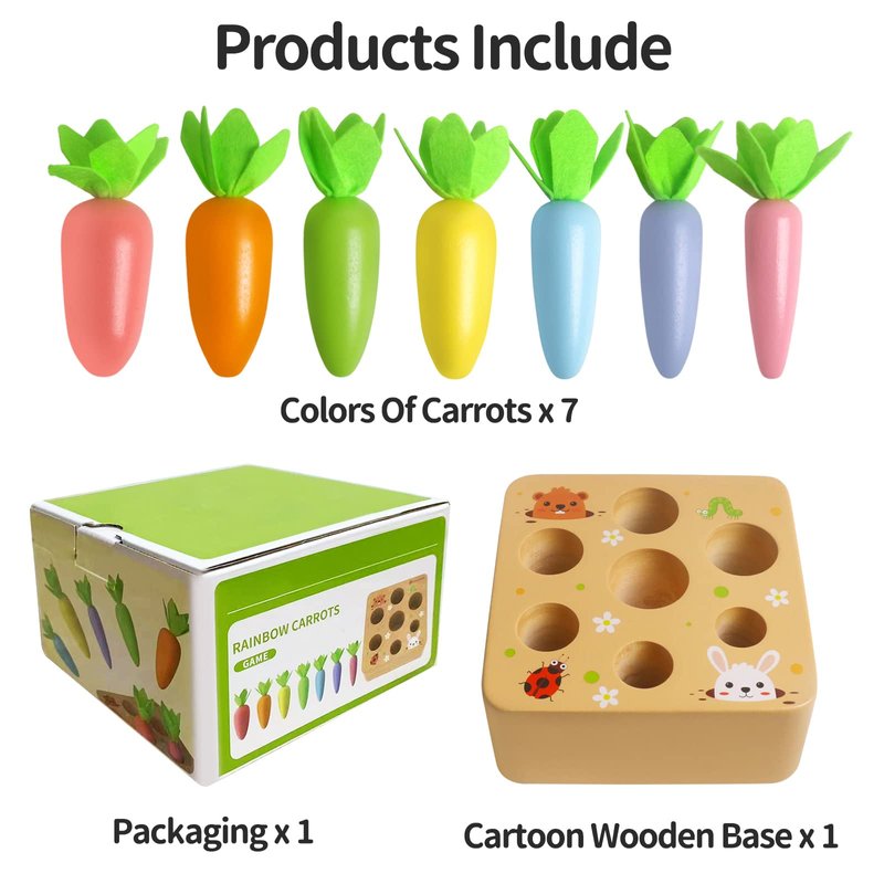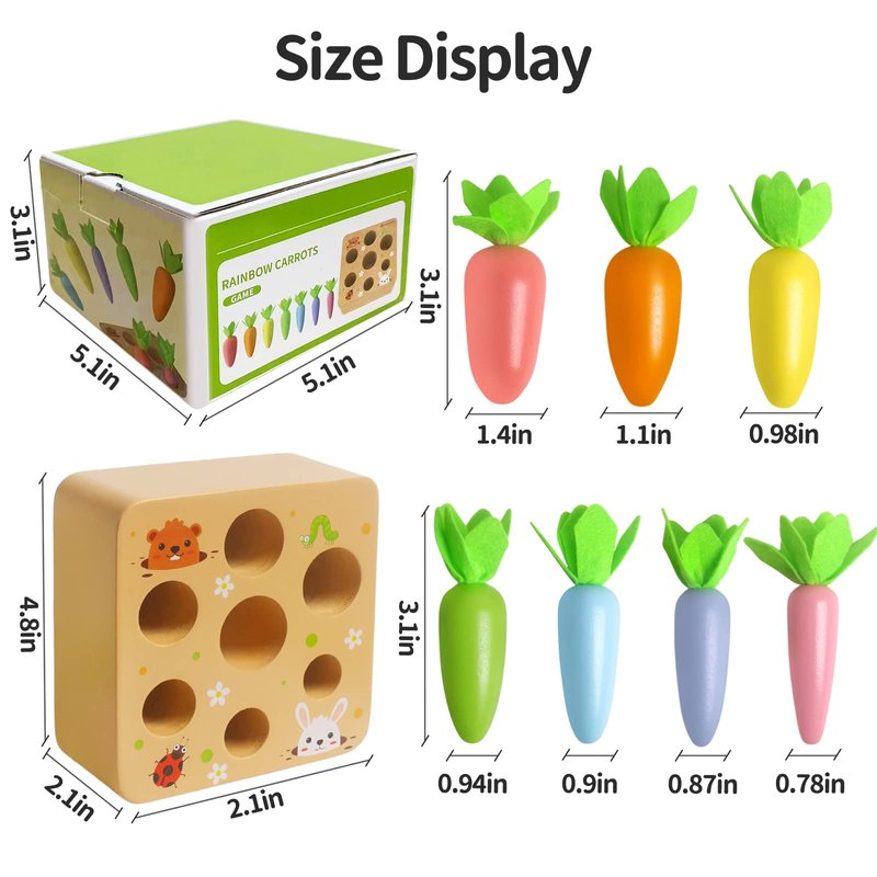 - Wooden Carrot Harvest Game: The Montessori Toys is a new kind of learning toy for toddlers. Develop your children's sorting skills through carrot sorting wooden toys. 7 different sizes of cute carrots of different sizes to match with holes for your child to explore, help your child exercise his intelligence and size exercise, and put it into the correct size slot. Help build strong fine motor skills and hand-eye collaboration.