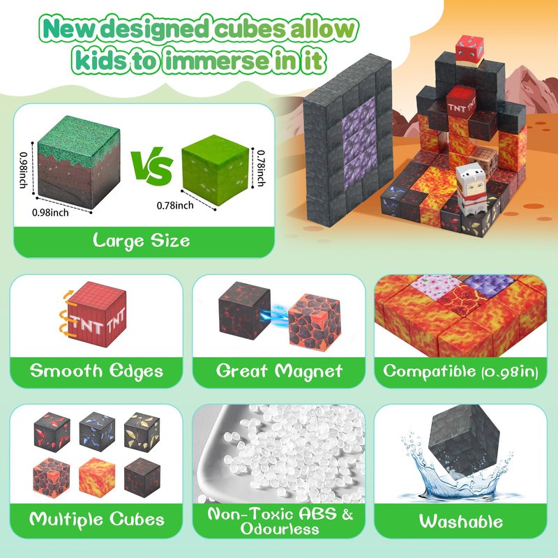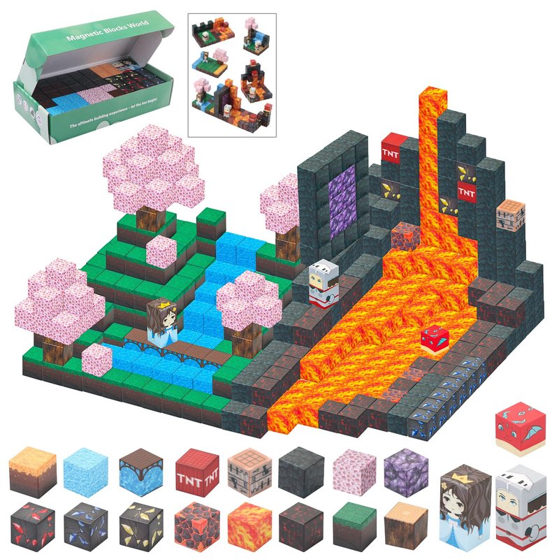 - 【An Exciting Adventure of Two Worlds】Start a new adventure with 100 magnetic blocks set. Kids are enable to experience a journey from a fiery lava river to a prairie full of cherry blossoms with the princess and prince. They can construct storylines at will, from the simple to the complex design of two very different world landscapes. This set of 100 pcs magnetic building cubes can be compatible with the 0.98IN magnet cubes on the market, increasing the possibility of more creation. It can provide hours of sensory pleasure, a great way to lure kids away from their electronic screens.