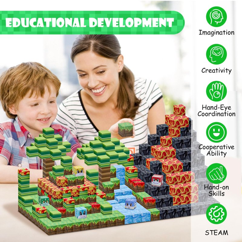- [Stem Sensory & Educational Toys] Magnetic Building Cubes combines fun and learning, which can stimulate children's creativity and exploration spirit, improve hands-on learning and problem-solving skills. Children can use these magnet blocks to build gurgling water, hot lava, and quiet forests, experience the process of building, rotation, demolition, and reconstruction, and feel the charm of magnetism and structure. When the children created the objects in the booklet, their self-confidence increased. Ideal for children aged 3-9 who are curious about the outside world.