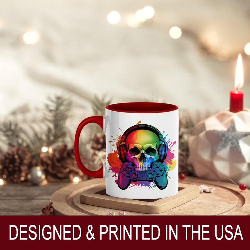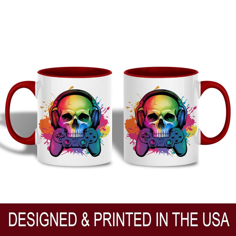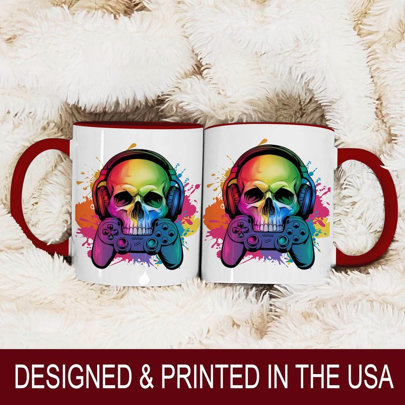 Skull Gamer Design Ceramic Mug, 11oz Coffee Cup with Colorful Headphones and Gaming Controller Theme, Fun Gift for Video Game Lovers, Unique Reusable Eco-Friendly Mug for Hot Beverages, Tea, Milk