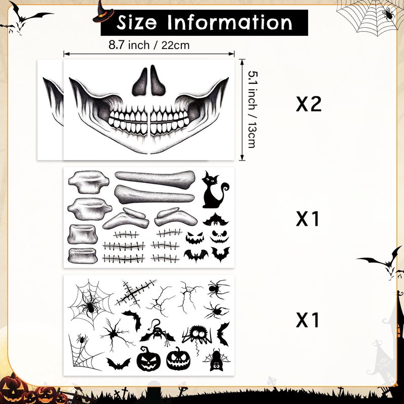 - Suitable for All Ages: These tattoos are safe for both kids and adults to wear for Halloween parties, trick-or-treating, or other festive occasions. The skeleton mouth tattoo is designed for adults (men and women), these tattoos offer an edgy and haunting look that's perfect for Halloween parties or costume events.