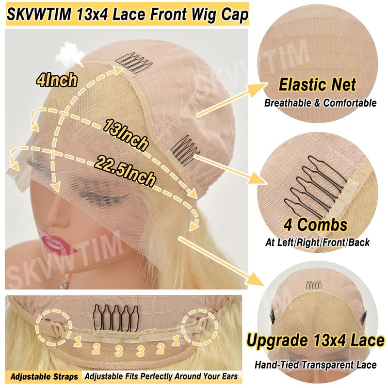 - 613 Blonde Wig Cap Size: 613 human hair wigs with medium cap size (21.5-22.5 Inch), fit most customers head perfectly, 4 combs with 2 adjustable straps easy to adjust tightness. Beginner friendly, easy to install and take off