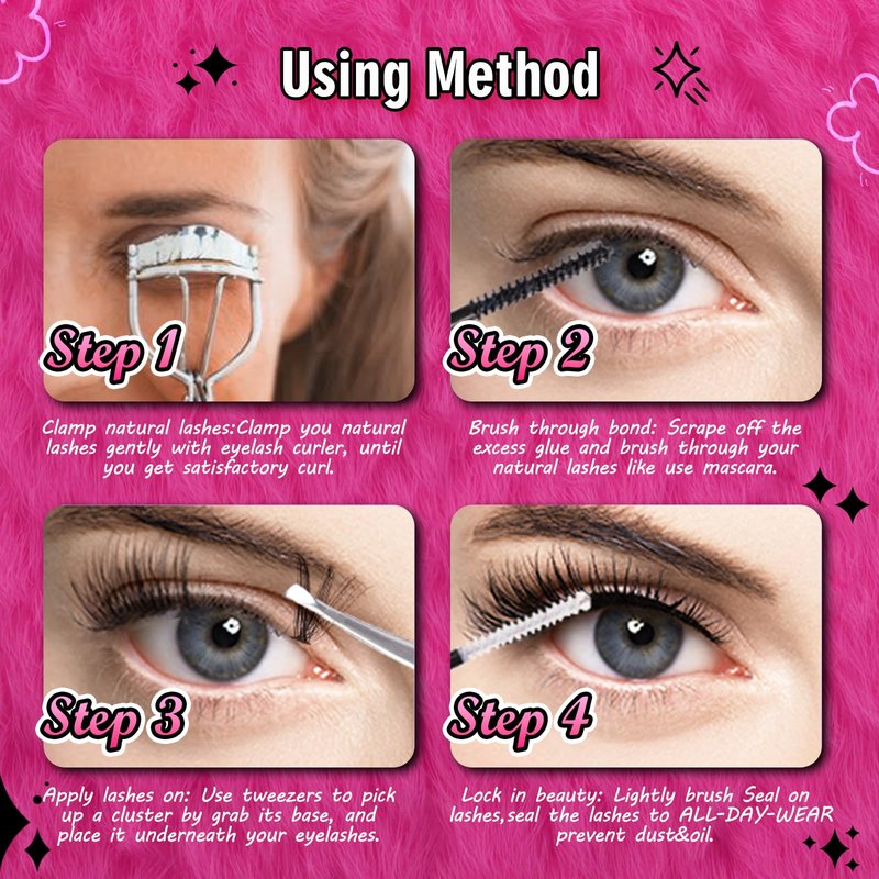 - Easy to Use Cluster Lashes Kit: Curl your own lashes and apply Lash Bond on your natural eyelashes; Use Lash Tweezers to pick up a cluster by grab its base, apply cluster lashes under natural lashes 1-2 mm away from the eyelid; Use Lash Seal brush to Lock