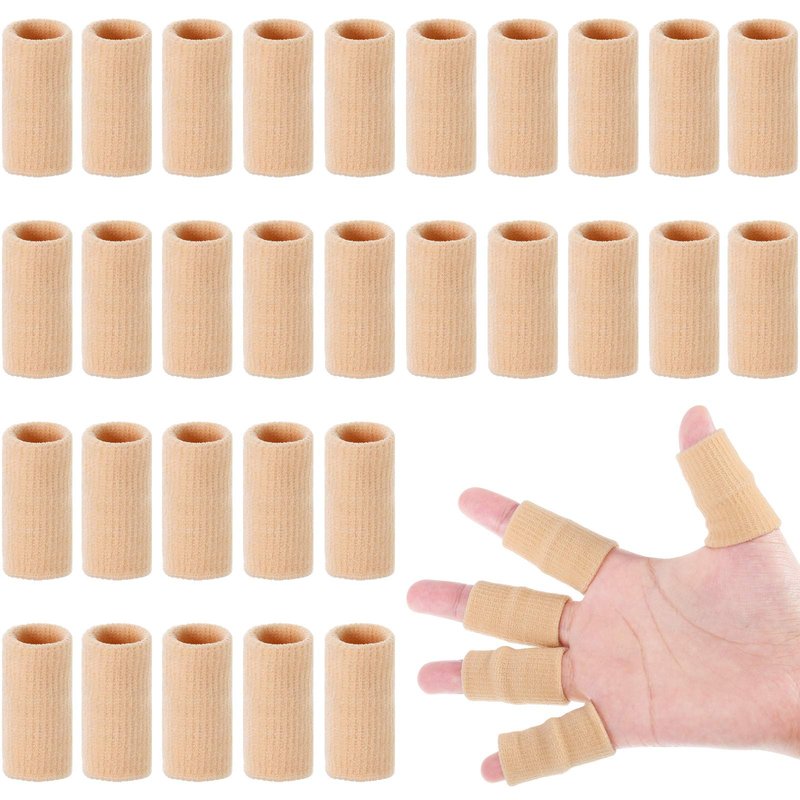 Skylety 30 Pieces Finger Sleeves with 1 Storage Bag, Thumb Splint Brace Support Protector Breathable Elastic Finger Tape for Pain Relief Arthritis Trigger Finger Sports Basketball Baseball (Beige)