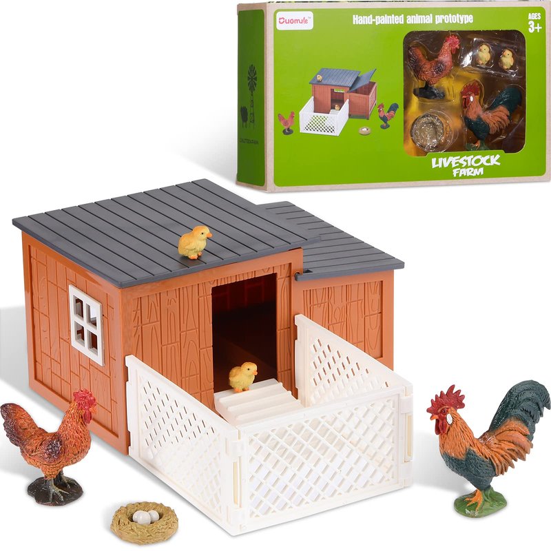 The chicken model playset includes 1 piece of the chicken house, 3 white fences, 1 rooster, 1 hen, 2 little chicks, 1 chicken nest with 3 eggs inside, which are 9 pieces in total, a thoughtful combination of the chicken world.