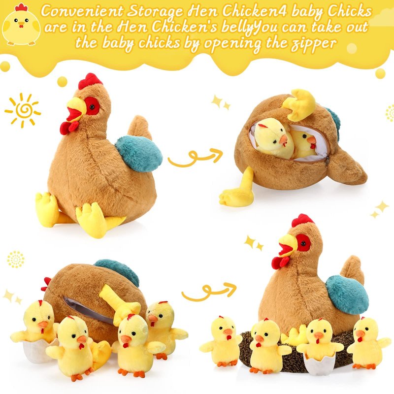 - Zippered Belly Design: the hen stuffed animal is designed with a zipper in its belly, which will allow you to put these small chicks into the belly and carry them around, as well as is convenient for you to store
