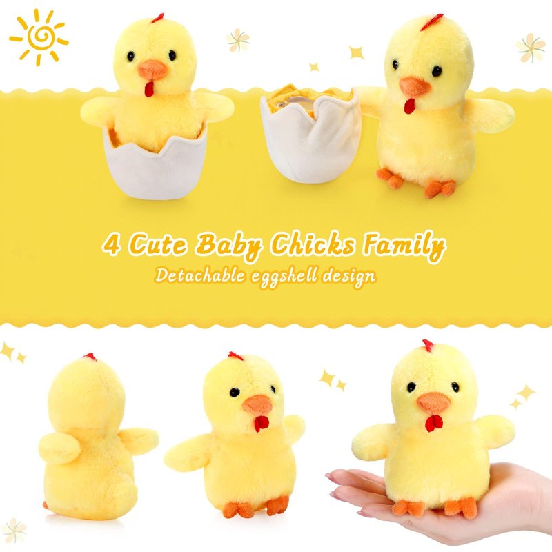 - Funny Chicken Dolls Kits: you will receive 1 hen chicken stuffed animal, 1 plush chicken coop, 1 plush chick with shell and 3 plush chicks without shell, a total of 6 pieces, which are nice combinations for you to play and decoration