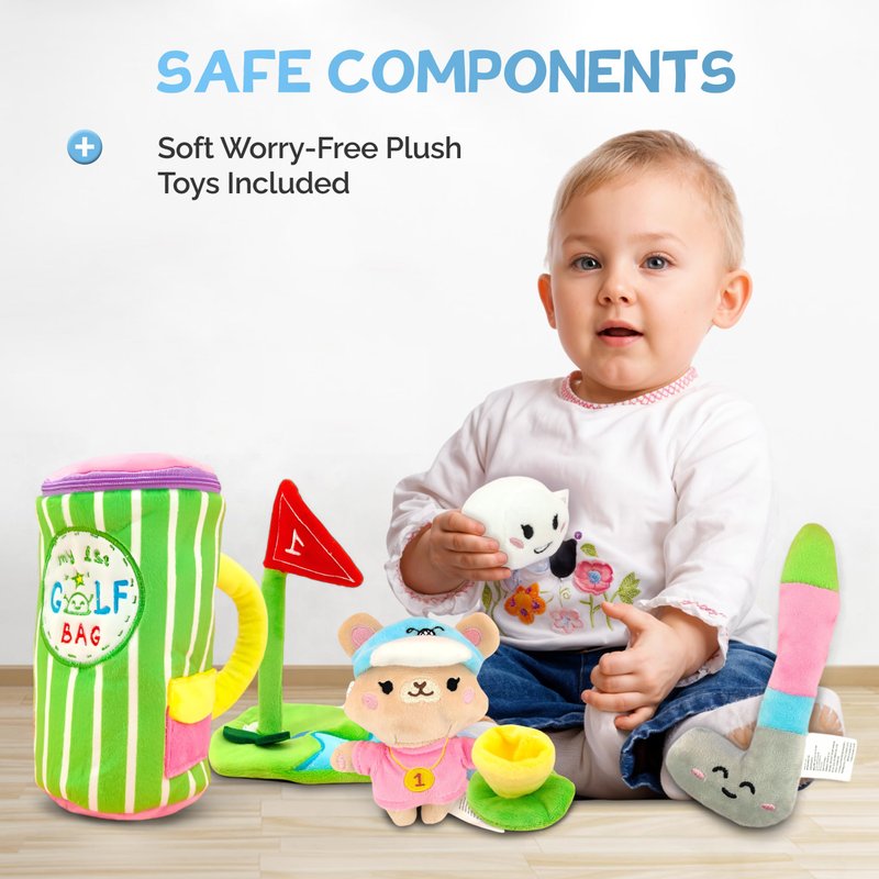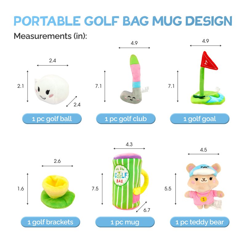 - Safe and Soft Components: The set includes a plush golf club, ball, mug, goal, and bracket, all made from soft and friendly materials. Parents can feel confident that can play safely with these soft toys.