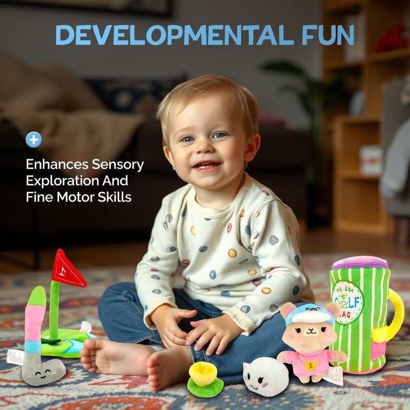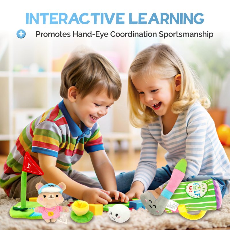 This playset goes beyond just play; it fosters developmental milestones by enhancing fine motor skills and hand-eye coordination as kids swing the plush golf club, aim for the goal, and interact with the various components. It encourages imaginative play, allowing mimicking real golf activities, which not only stimulates creativity but also instills values such as sportsmanship and teamwork as they take turns and set goals.