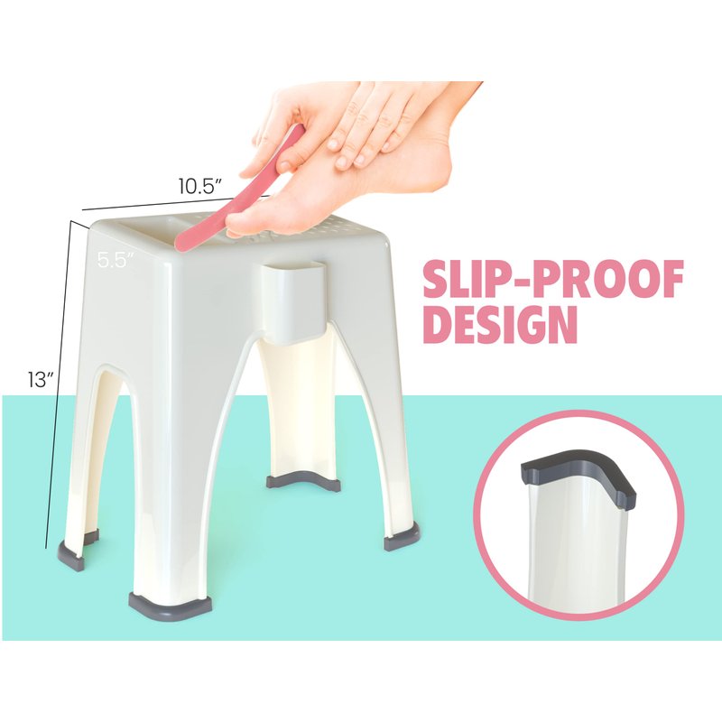 - [LIGHTWEIGHT AND DURABLE DESIGN] - This small shower stool is made of hard plastic that can hold up to 85 lbs of weight while maintaining a perfect position and height of your legs. This plastic shower stool has a size of 9.27 x 7 x 10 inches. A perfect fit as a corner shower stool for inside shower.