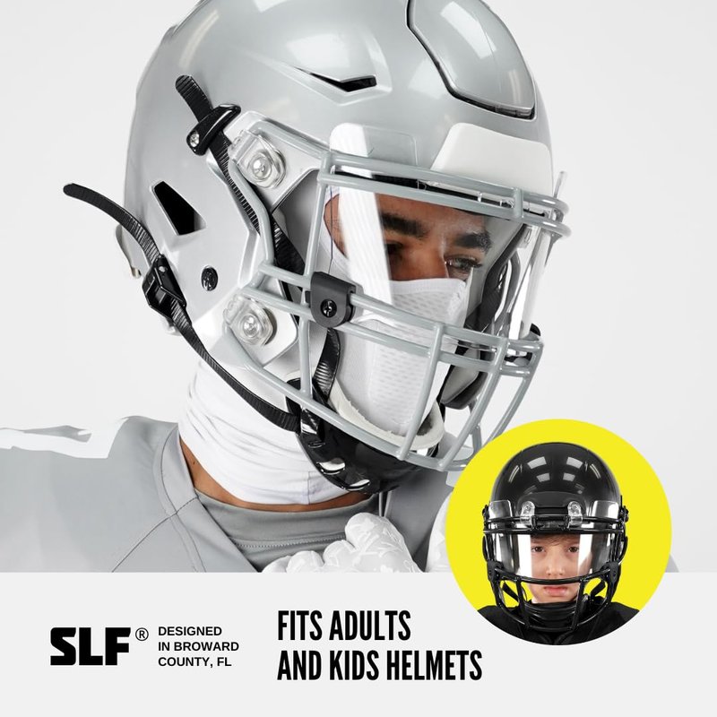 Universal Fit For Nearly All Helmets, Youth and Adult - SLEEFS football shields fit all popular football helmet modles from the leading brands: Riddell (Speed, Speedflex, Victor, Revolution), Schutt (F7, Vengeance, Air, Splash), Xenith (Shadow, X2E, Epic), SG DBS.001, VICIS Zero1 and more. Fits both adult and youth sizes (some adjustments required for smaller helmets)