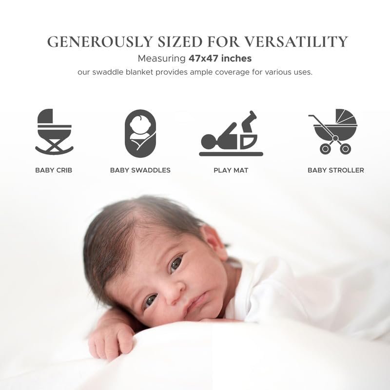 - GENEROUSLY SIZED FOR VERSATILITY: Measuring 47x47 inches, our swaddle blanket provides ample coverage for various uses. Whether you're swaddling your baby, using it as a stroller cover, or creating a makeshift nursing cover, its versatile size ensures comfort and convenience.