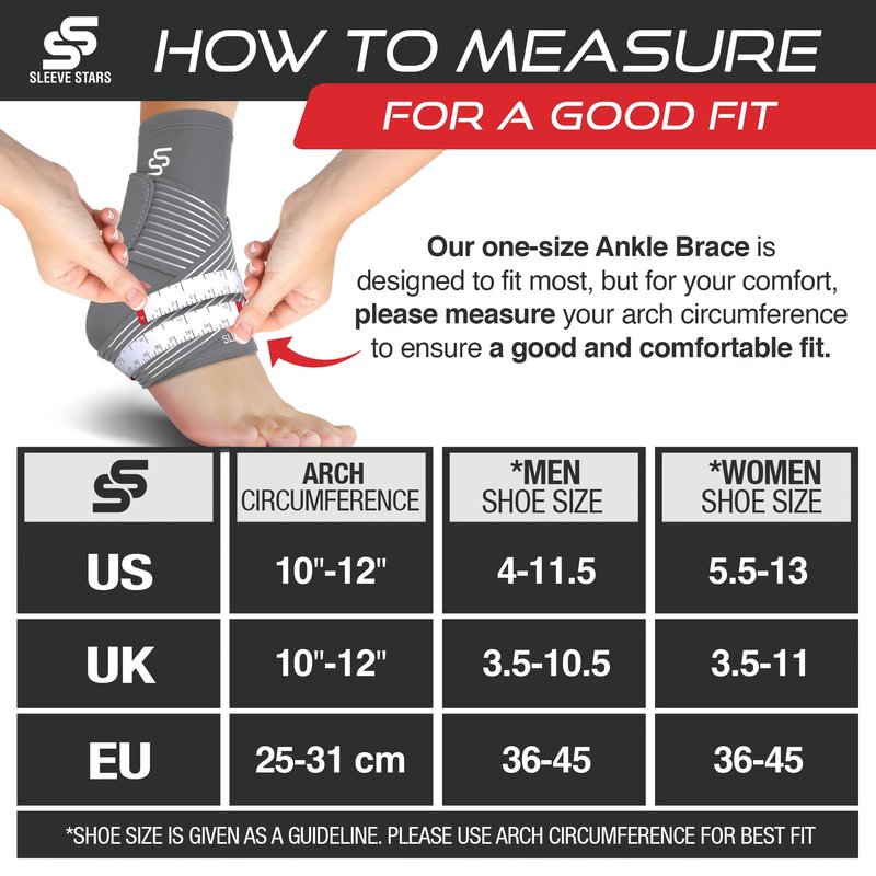 - ✅ Discover your ideal fit!: Our ankle compression sleeve is designed to be versatile, but not every foot is the same. Consult our product images for precise measurements. Shoe sizes are a helpful reference, but measuring your arch circumference guarantees a tailored fit.