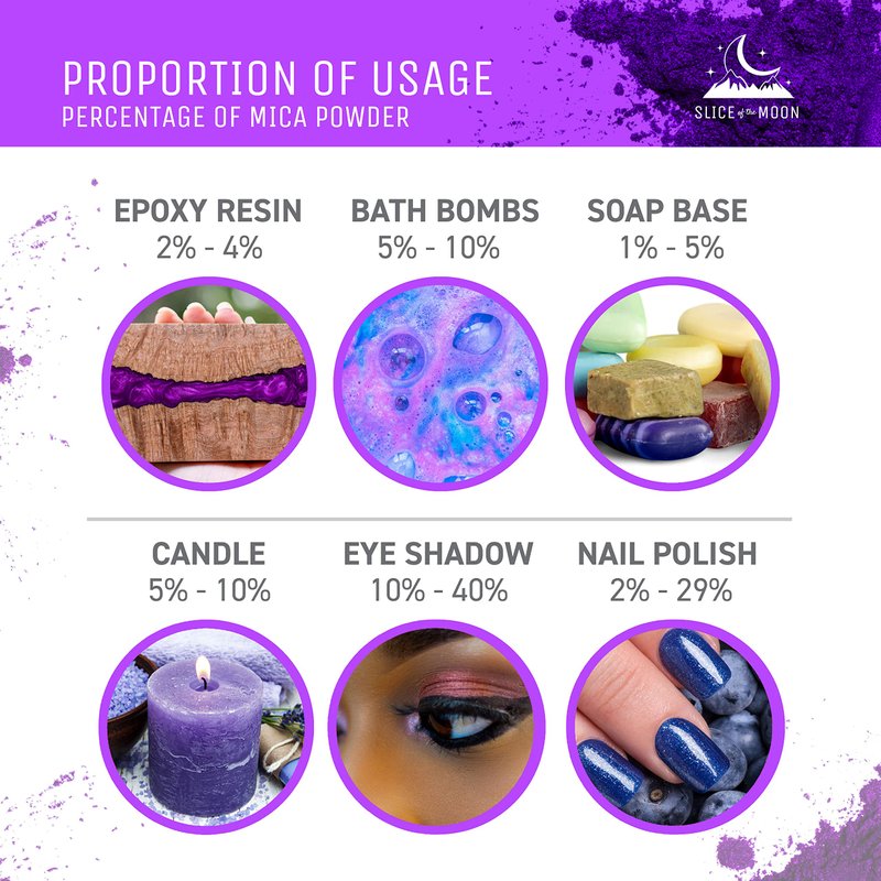 - CREATE IN COLOR: Not much is needed to blend, mix, and design with our wide range of mica colors. Whether creating your own colors for paint, bath bombs, epoxy resin projects, candle designs, DIY creations, or jewelry — there is no limit to what can be done with a little mica powder.
