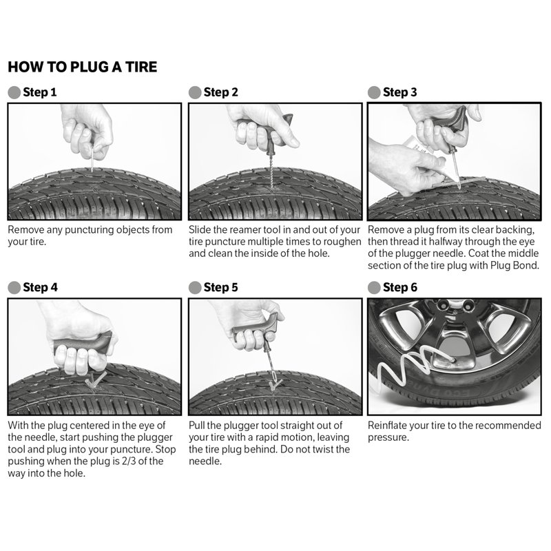 - Use the ergonomic, pistol-grip handle reamer and plugger tools to clean the hole and insert the heavy duty tire strings (available in two sizes!).