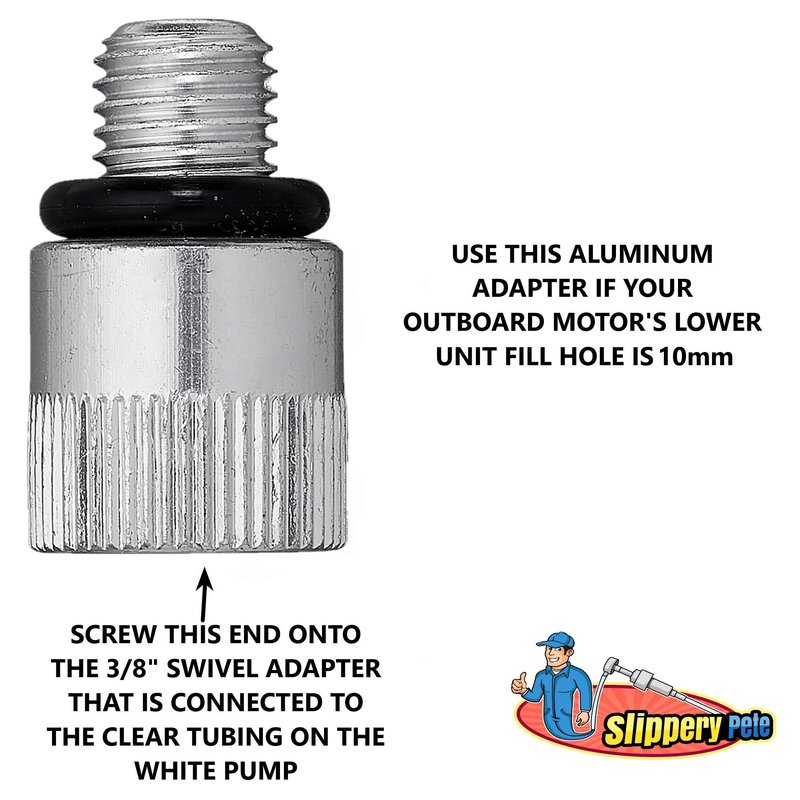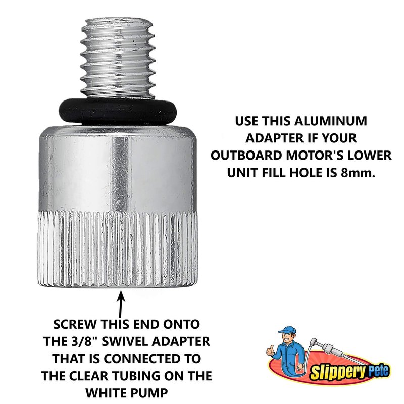 - 🚤 THIS GEAR OIL CHANGE KIT includes 3 adapter sizes. 3/8"(Swivel, Metal), 8mm and 10mm (Metal). Take the guess work out of figuring out the size of your Lower Unit's gear oil drain plug. (WON'T FIT VOLVO PENTA)