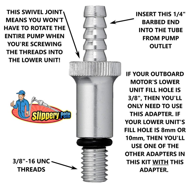 Slippery Pete - Lower Unit Gear Oil Pump for Standard Quart Bottles, Includes 3/8 inch Metal Swivel, 8mm and 10mm Adapters Fit Most Marine Boat Outboard Motors (NOT COMPATIBLE WITH VOLVO PENTA)