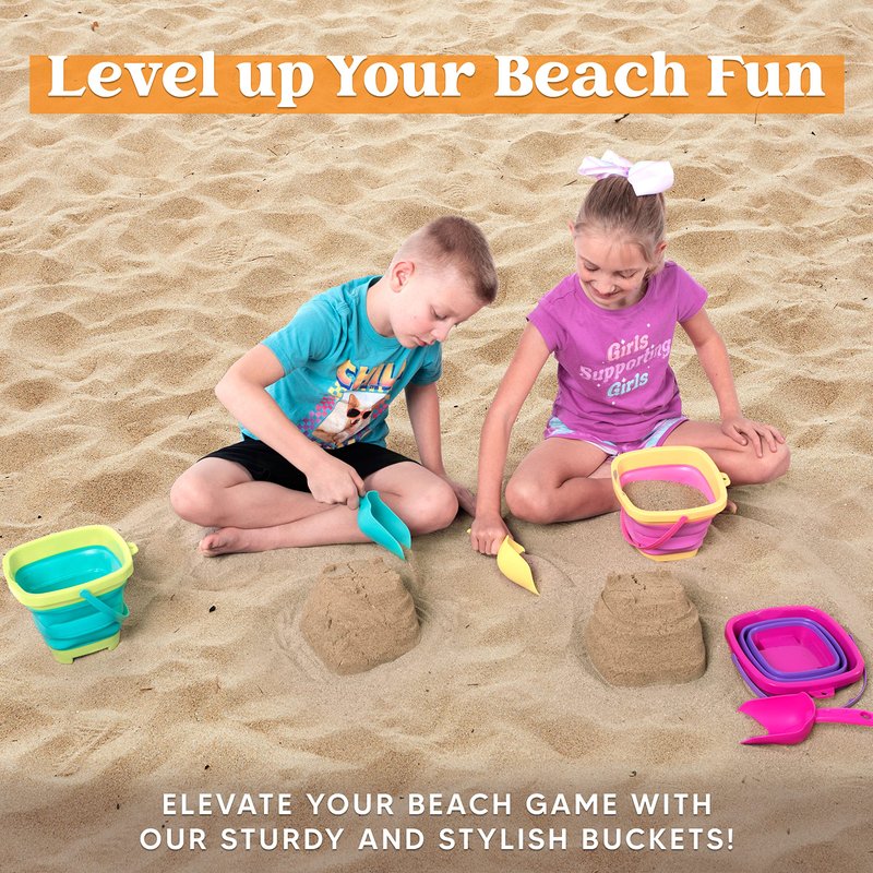 - SUPER VALUE PACK: Our kid's summer toys Set includes 3 collapsible square beach buckets with handles, 3 sand shovels, and 1 mesh backpack, each bucket is about 8.1” x 6.3” 0.66 Gallons Capacity when unfolded. Complete outdoor and indoor sand play sets, all for an unbelievable price! This bundle of sand toys will be adored by your child! For age over 36 Months.
