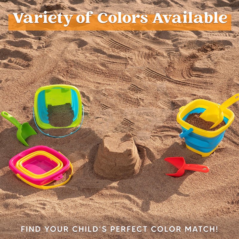 - Super Value: This beach sand toy includes 3 sets of Foldable Pail Bucket with Shovels with 3 bright and vivid colors. The maximum capacity of each bucket is 0.53 Gallons.