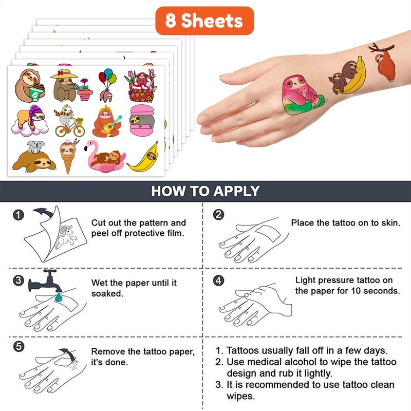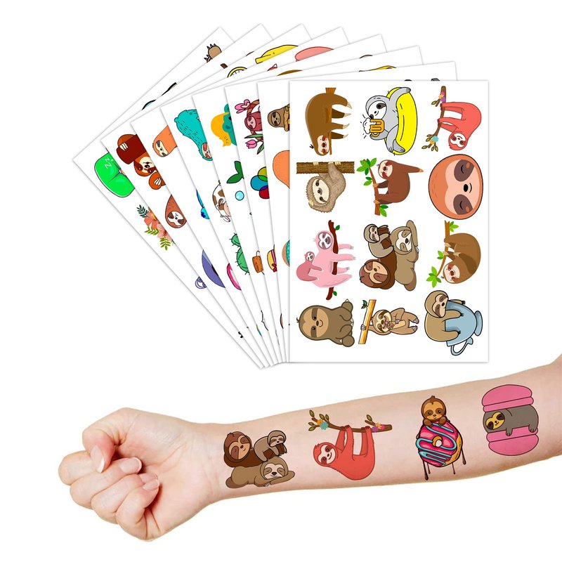 - ✨ Cute Sloth Party Supplies: 8 sheets Sloth themed temporary tattoos stickers, features an assortment of cute themed characters, each pattern measures 6.1 x 3.1 inch , all kinds of designs and colors will bring more fun to your party, one size fit all adult and kids.