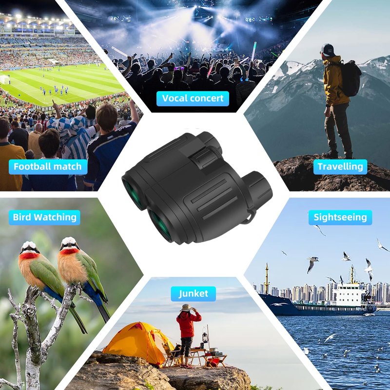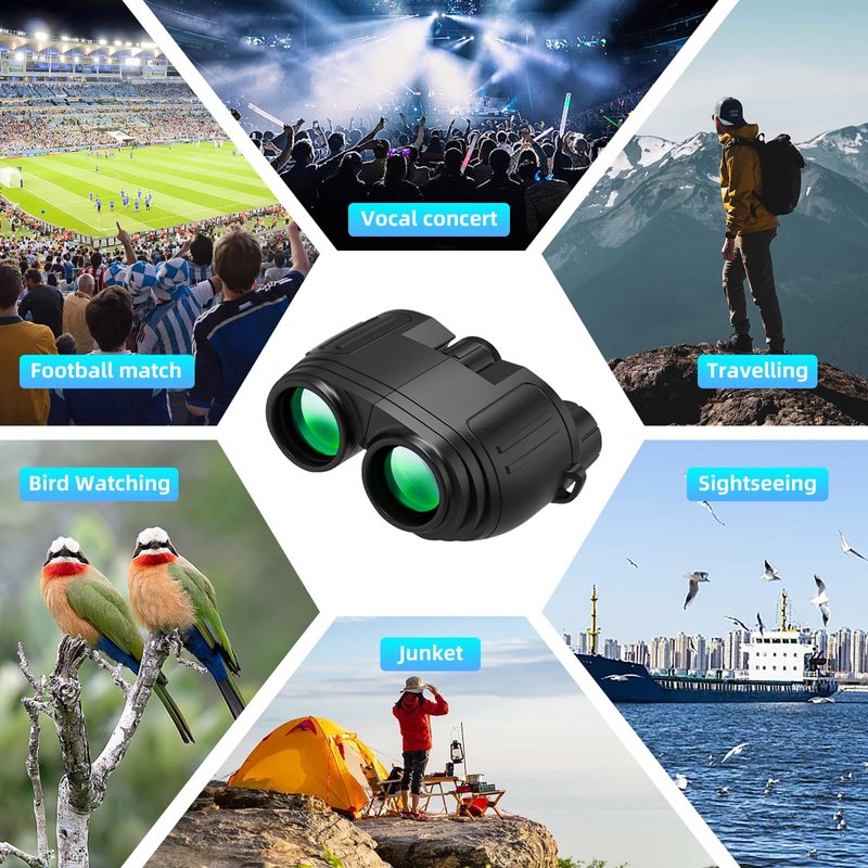 - 【Lightweight, Waterproof, Pocket Binoculars Design】:Pocket binoculars body IPX67 waterproof and anti-fog, made of shockproof PVC+ABS material, weighs only 0.5 pounds and can be folded to the size of your palm. Kids can also use them easily, compact design makes them easy to store in your pocket or backpack.