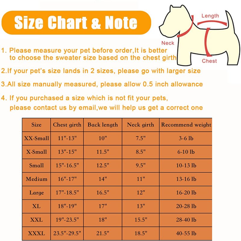 ✅ NOTE: Please measure your dog's chest and back length before ordering it (It is better to choose the sweater size based on the back and chest girth but not Weight) We also suggest you choose a larger size if you worry about it will too small for your pets
