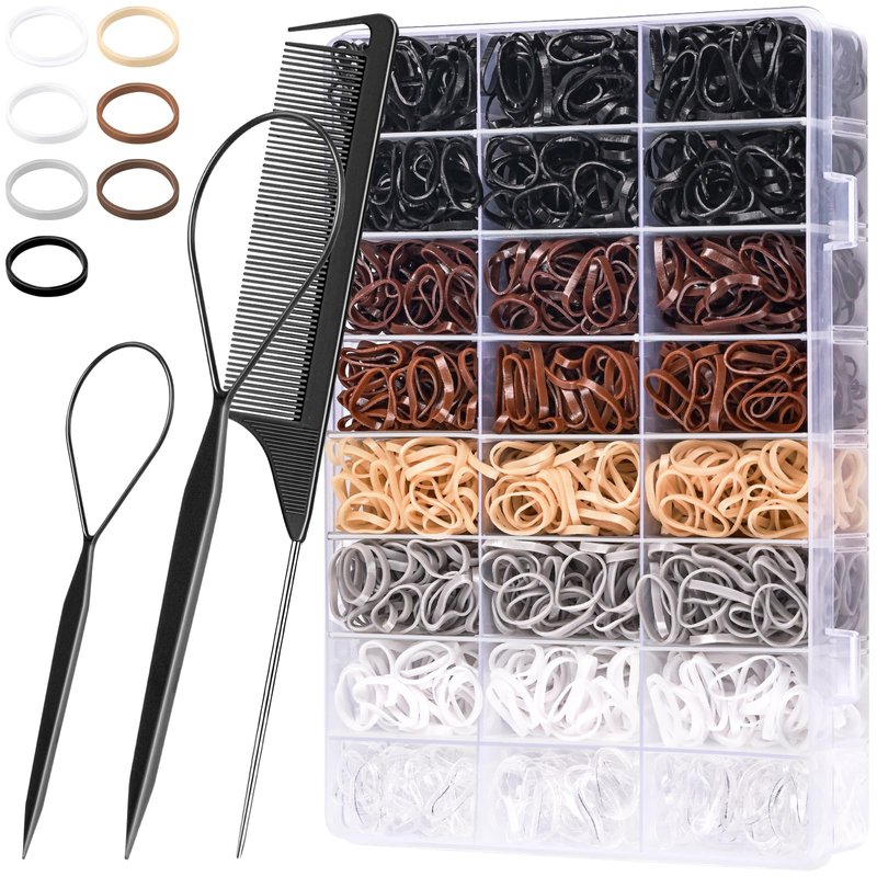 TsMADDTs 2000 Pcs Hair Rubber Bands with Organizer Box, Small Elastic Hair Ties, 7 Natural Colors Mini Rubber Bands with Hair Tail Tools, Rat Tail Comb
