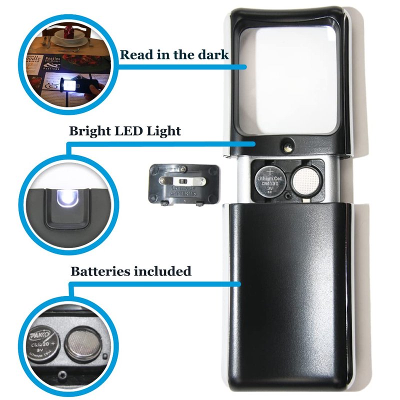 - ✅ AMAZING! Enough FRUSTRATION with NO Light while reading. LED lights viewed Area SAVES YOUR NERVES on a Trip. Light of the illuminated pocket magnifier glasses turns on/off automatic. Light is even casts few shadows. Energy efficient LED use little Power and Last long. Batteries are Included