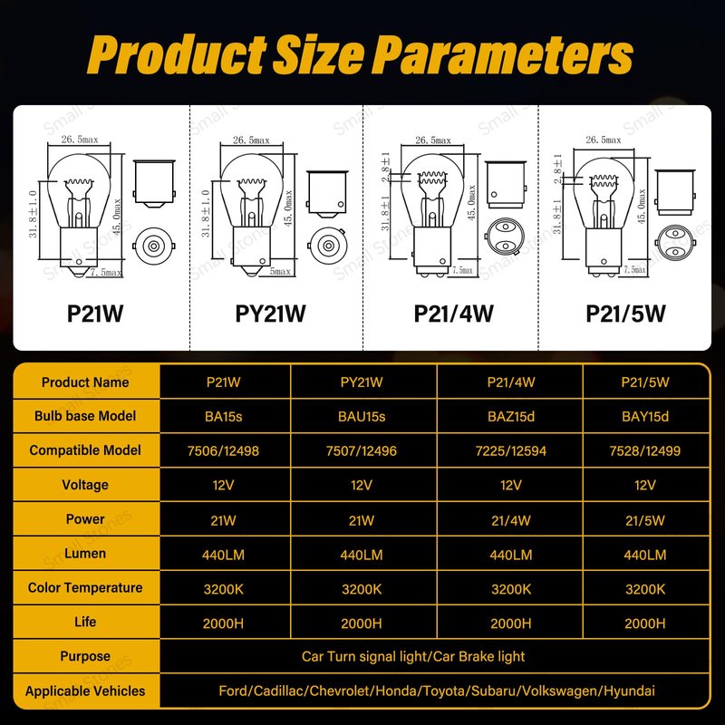 - Product parameters: 12V 21/5W; Color temperature: 3200K; Brightness: 440LM; Service life: 2000H