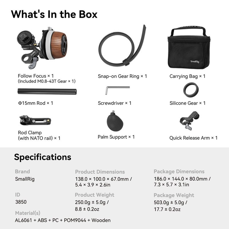 - 【What In the Box】Follow Focus x 1 (Included M0.8-43T Gear x 1) , Quick Release Arm x 1, Silicone Gear x 1, Φ15mm Rod x 1, Rod Clamp (with NATO rail) x 1, Snap-on Gear Ring x 1, Palm Support x 1, Screwdriver x 1, Carrying Bag x 1