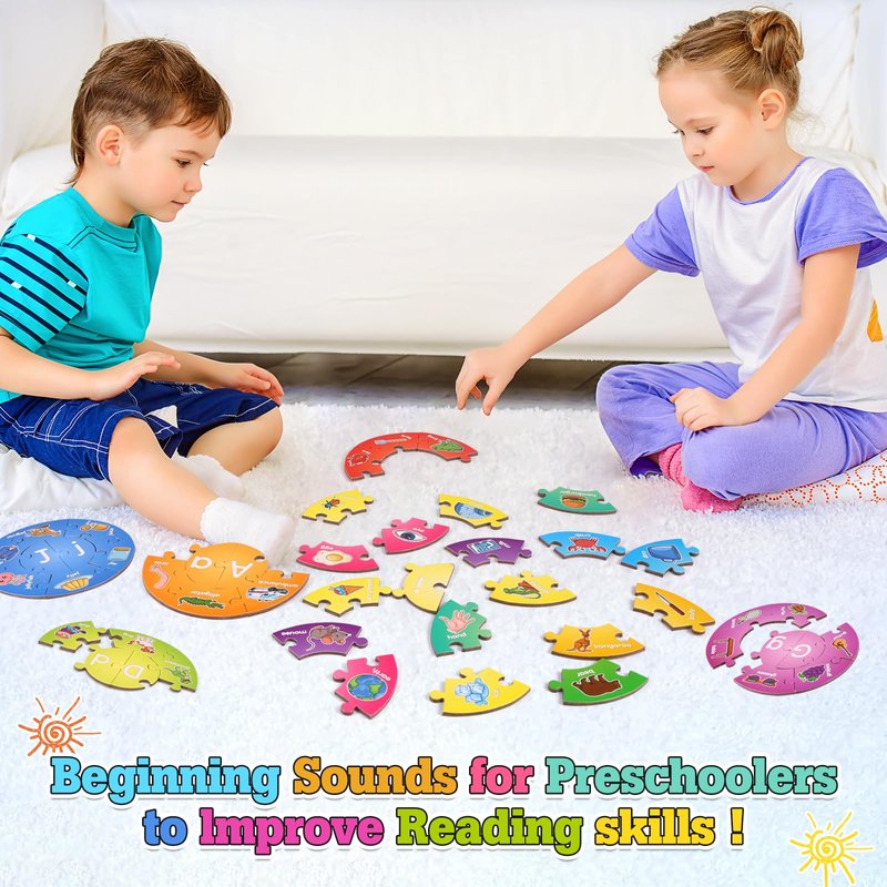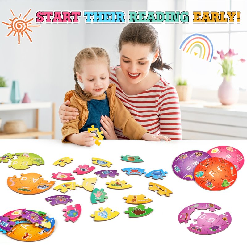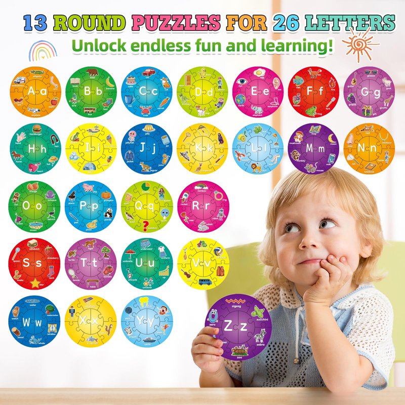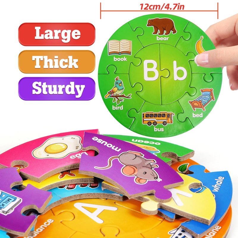 - Complete Alphabet Learning Set: Engage your child's early learning with our 26-letter round alphabet puzzle set. Each puzzle is color-coded and double-sided, featuring uppercase and lowercase letters along with corresponding images and words for comprehensive alphabet recognition.