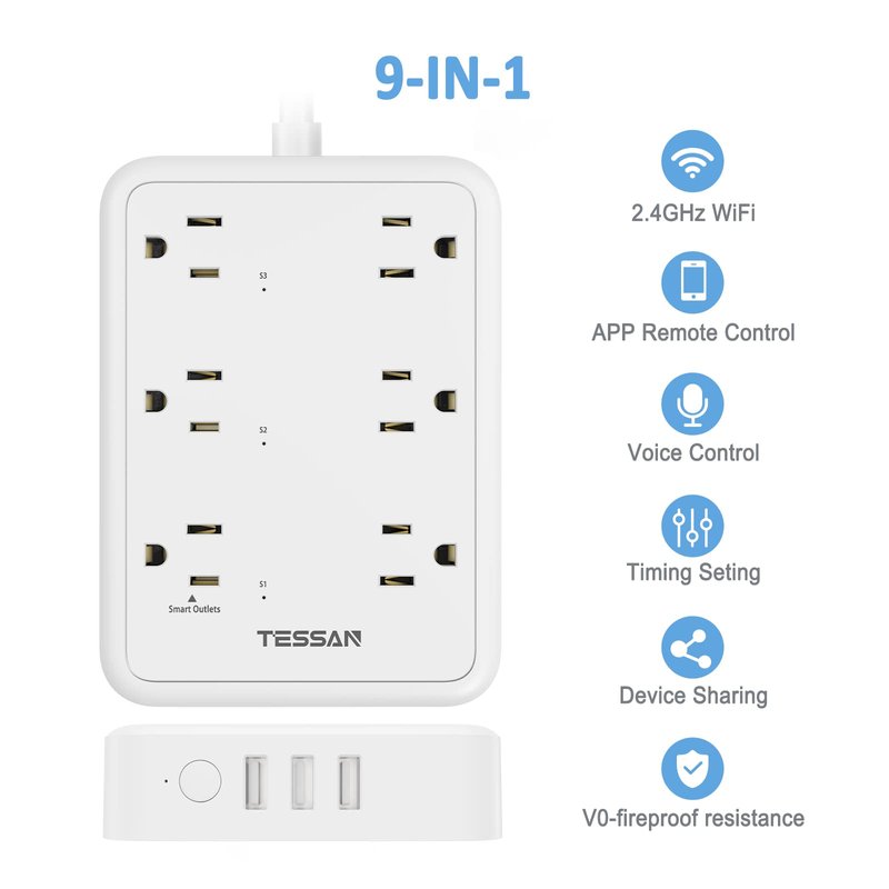 TESSAN WiFi Smart Power Strip with 3 smart outlets, 3 always-on outlets and 3 USB charging ports, with 1.5 inches long space in between, large spacing makes it easier to use for all kinds of equipment. The compact design saves more space, suitable for the home, office, and college dorm room