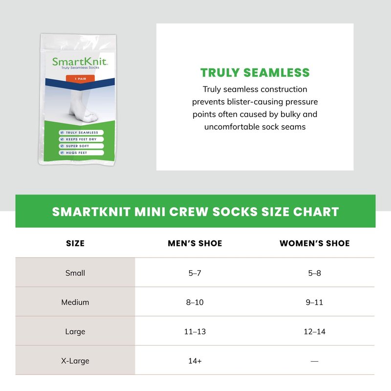 SMARTKNIT Seamless Mini-Crew Socks for Diabetes, Arthritis or Sensitive Feet, 1 Pair (2 Count), Small, Grey