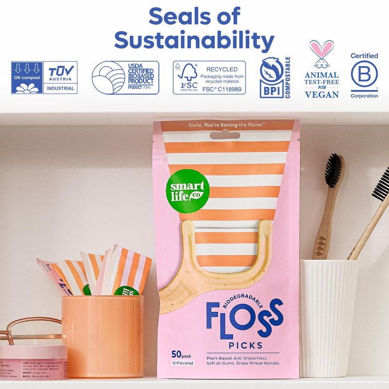 SmartLifeco Biodegradable* Dental Floss Picks - Eco-Friendly Tooth Flosser for Adults & Kids | Straw Wheat Unwaxed Floss | Toothpick Stick Soft On Gum & Teeth | Compostable*, Vegan, Unflavored 300ct