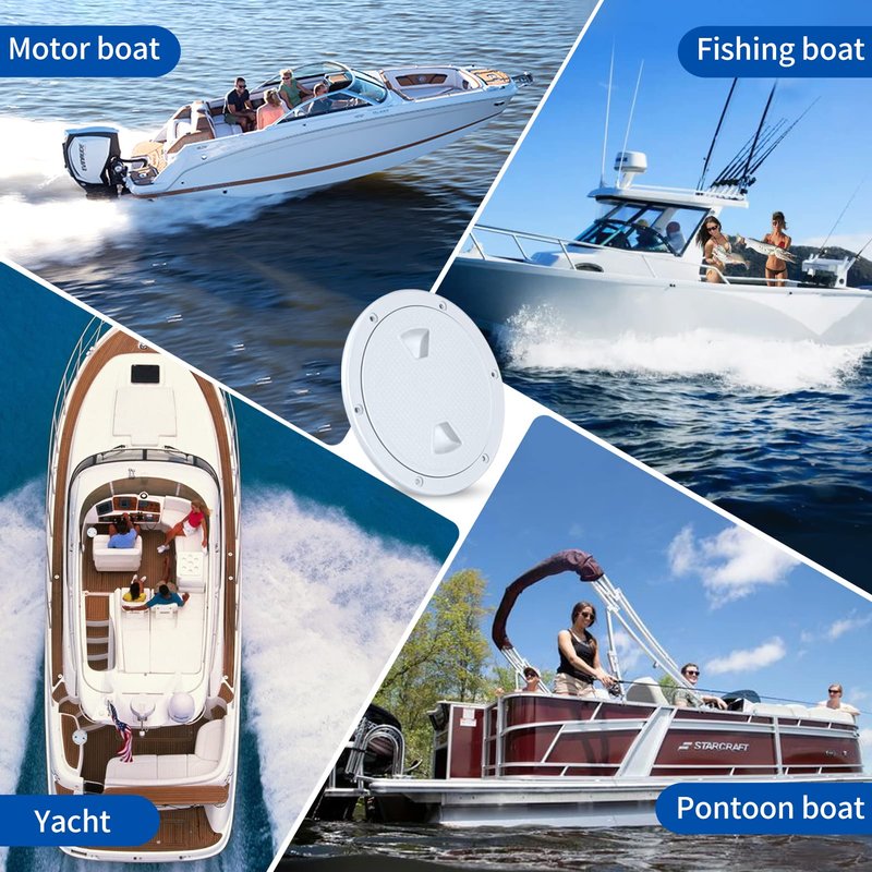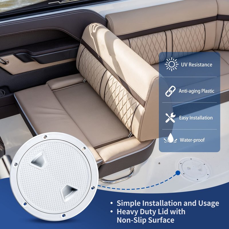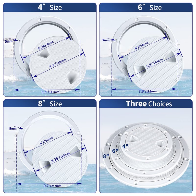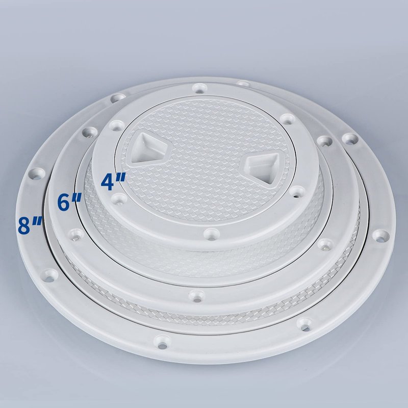 Boat Hatch White 4" 6" 8" Round Non Slip Inspection Hatch w/Detachable Cover for Marine Boat Yacht Truck Rv.-Ideal for interior and exterior applications -reinforced design with a non-slip surface -Easy to install. Rotary witch.Separate cover plate and chassis -No drilling required, direct installation. It is more convenient to use.4 inch -Outside Dimension: 5.5" (141mm) ; Inside Dimension:4"(101.6mm) 6 inch -Outside Dimension: 7.7" (196mm) ; Inside Dimension:6"(152mm) 8 inch -Outside Dimension: 9.7" (245mm) ; Inside Dimension:8"(203mm)