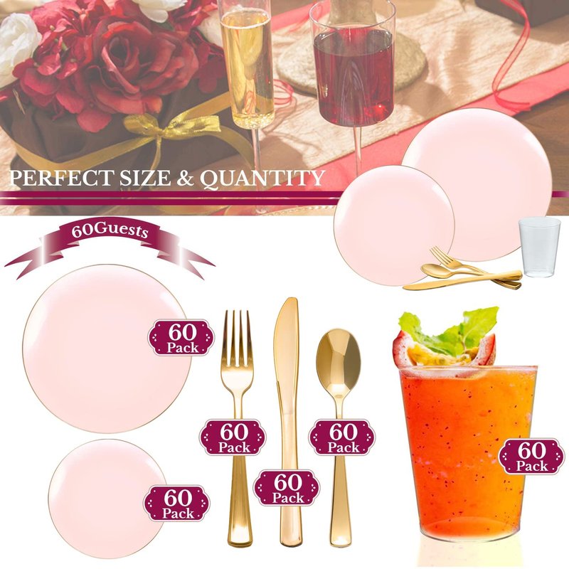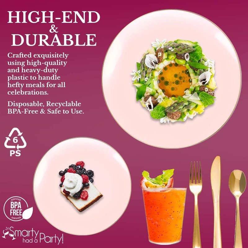 Smarty Had A Party Disposable Plastic Plates with Rim Design, Organic Round Dinnerware Bulk Order for Wedding, Birthday & All Occasions (Pink with Gold, Wedding Value Set (60 Guests))