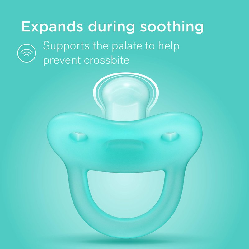 - Orthodontic Shape: Developed by a leading Padiatric Dentist, our anatomical design encourages the development of suck, swallow and breathe mechanisms. Thanks to the patented design, the soother expands slightly to support babys palate during soothing to help prevent cross bite.
