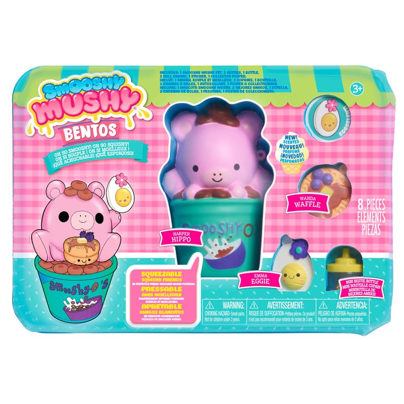 - Squeezable Sensory Fun: Find a squeezable, squishy friend – and lots of cool accessories with the Smooshy Mushy Bento Box Harper Hippo set.