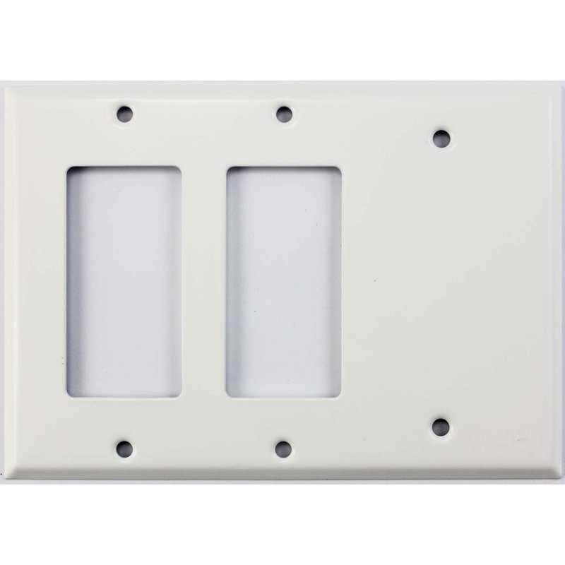 This two gang wall plate is a stamped steel cover plate that has a smooth white finish. The plate will accommodate two GFI/rocker device and one blank. Plate Measures: 4 1/2” by 6 3/8”