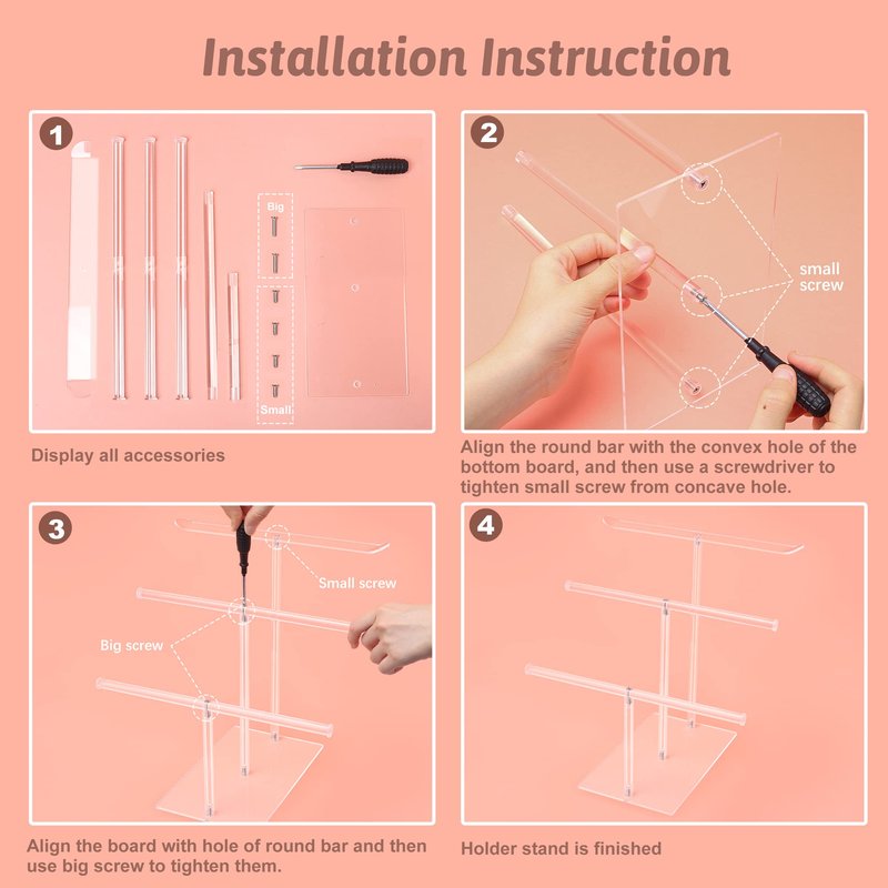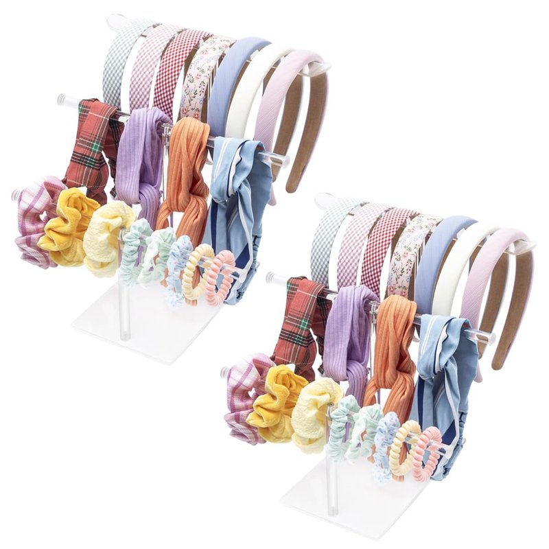 - ✔️【Excellent Design】: There is bending design at the end of the acrylic panels, which can stop headbands, hair ties, scrunchies from sliding off. The top flat panel will easily to place headbands stable without shake. And long stick below can display hair tie, scrunchies, earrings, bracelets, rings etc.