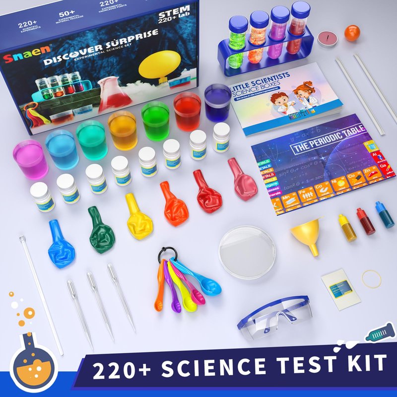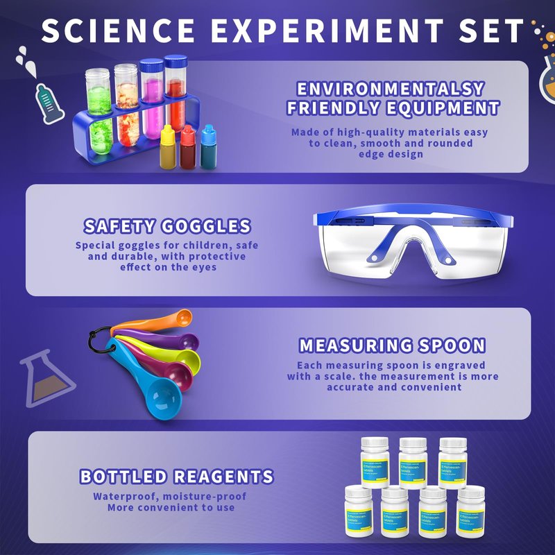 - Complete 48-pieces Science Test Kit - We provide safe and durable scientific tools for 120+ experiments, including 1 goggles, 8 bottles of chemical materials, 4 large test tubes with scales, 5 measuring spoons, 7 measuring cups, 1 funnel, 3 droppers, 6 balloons, 1 table tennis, 1 candle, 1 periodic table of elements, etc. (Water and oil are not included)