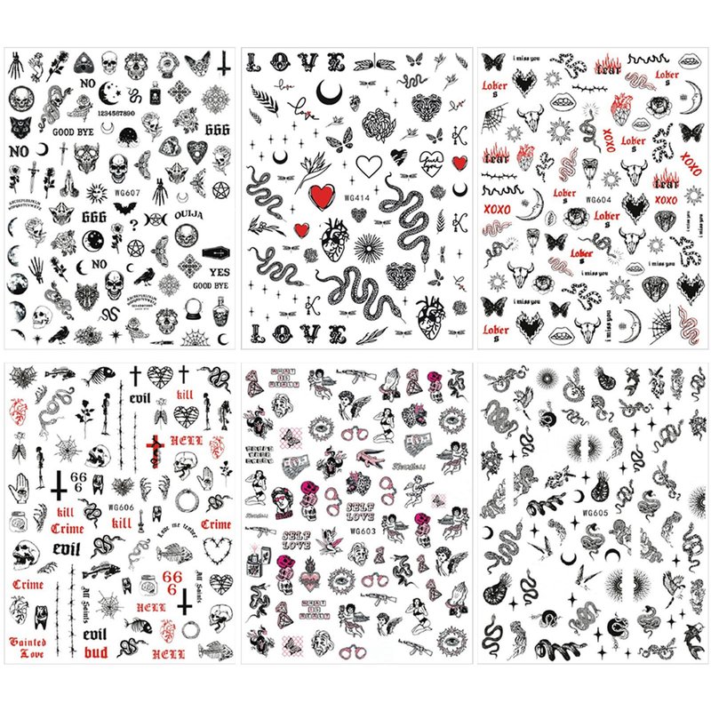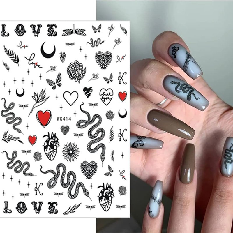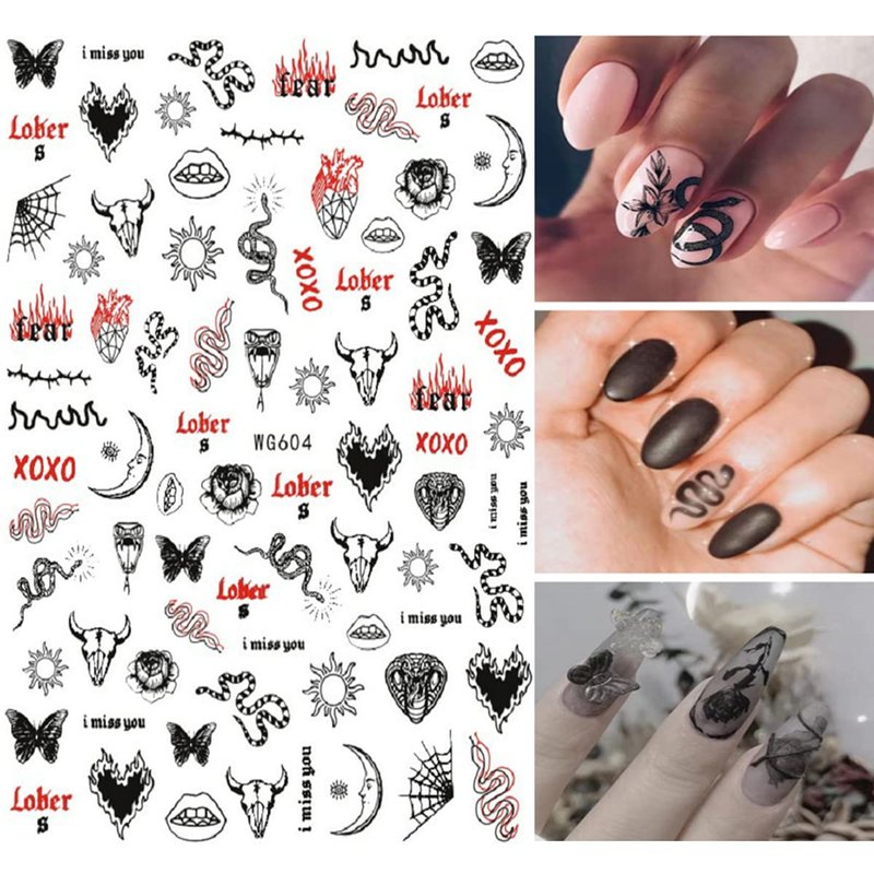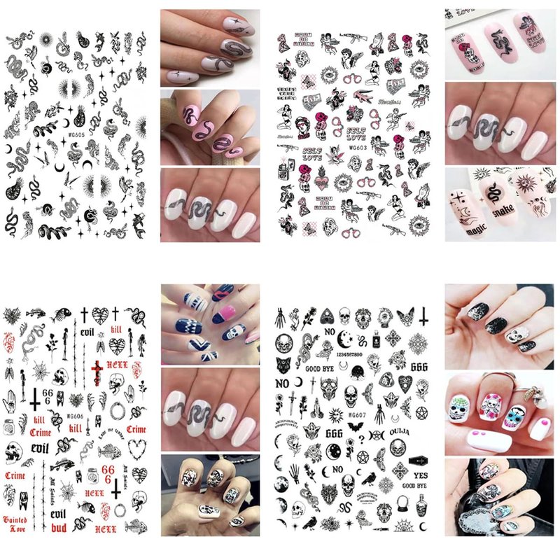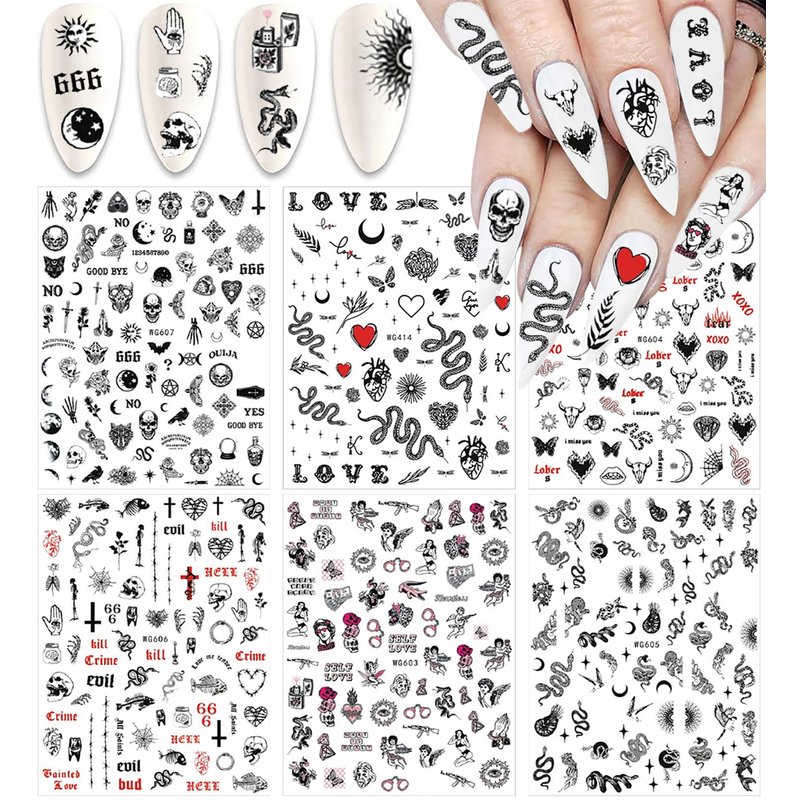 Snake Nail Art Stickers Decals Nail Art Supplies 3D Self Adhesive Nail Stickers Dark Skull Heart Cupid Angel Lips Ghost Nail Decals for Acrylic Nails Designs Manicure Tips Decoration (6 Sheets)