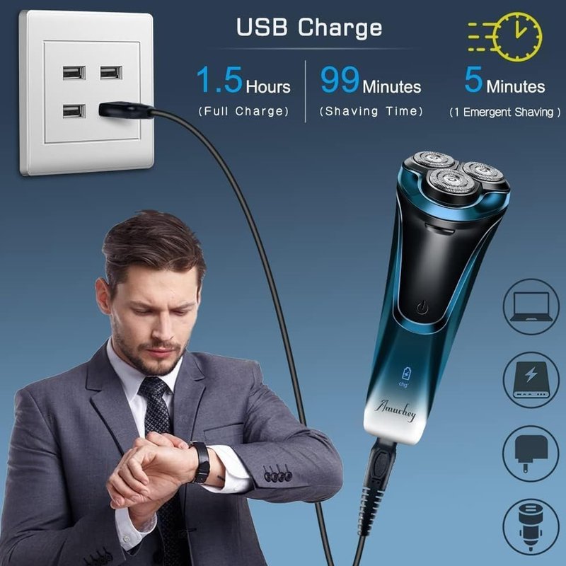- Fast & Convenient USB Charging:Charge on-the-go with the Electric Razor's USB fast charging capability. Enjoy up to 99 minutes of shaving with just a quick 1.5-hour charge, making it ideal for busy professionals or travelers. Compatible with power banks, laptops, and car chargers for ultimate convenience