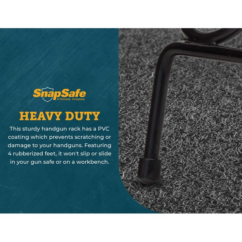 - Heavy Duty – This sturdy handgun rack has a PVC coating which prevents scratching or damage to your handguns. Featuring 4 rubberized feet, it won't slip or slide in your gun safe or on a workbench