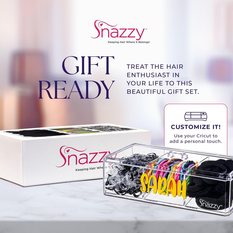 Always stay stylish with the Snazzy Deluxe Hair Accessories Gift Set. Our premium gift set arrives in a gift ready transparent acrylic triple compartment container to help you keep track of all your hair bands and accessories.