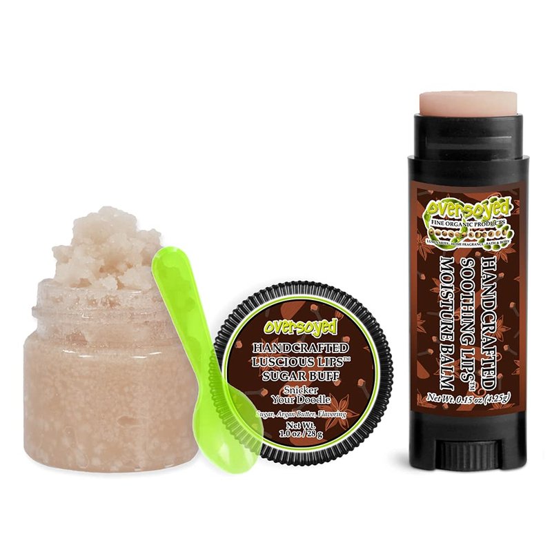 Snicker Your Doodle Soothing & Luscious Lips by OverSoyed Exfoliator & Chapped Lip Repair Lip Care Combo | Artisan Handcrafted to Order Snickerdoodle Cookie Cinnamon Buttery Caramel Flavored Exfoliating Sugar Lip Scrub & Lip Moisturizer Balm Gift Set