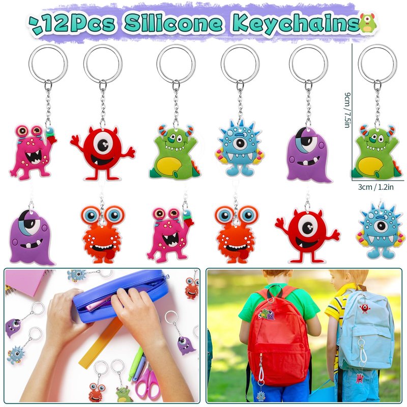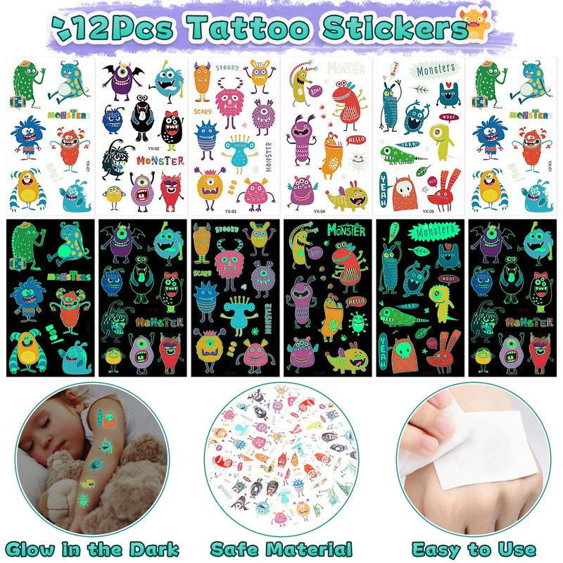 - 98Pcs Monster Party Favors - Package include 98pcs, serve for 12 kids. We offer 12 monster drinking straws, 12 monster keychains, 12 monster luminous tattoo stickers, 12 monster slap bracelets, 50 monster stickers, complete set for you to use as favors at the party. This is a set of cute and personalized birthday party gifts, especially suitable for little boys. The cute monster design is colorful and eye-catching, making it a very attractive set of party favors for children.