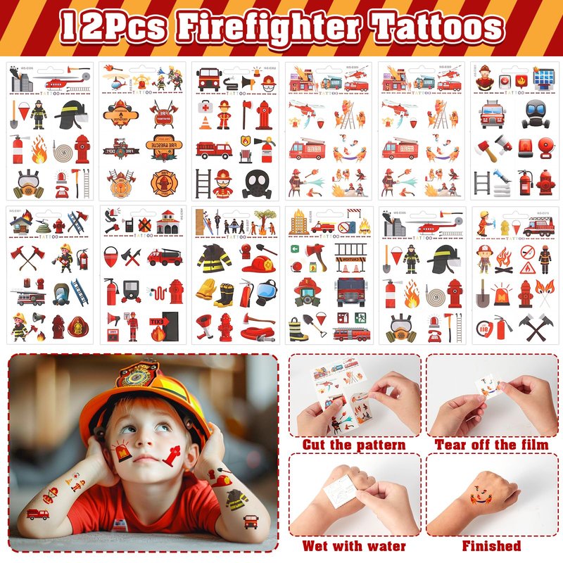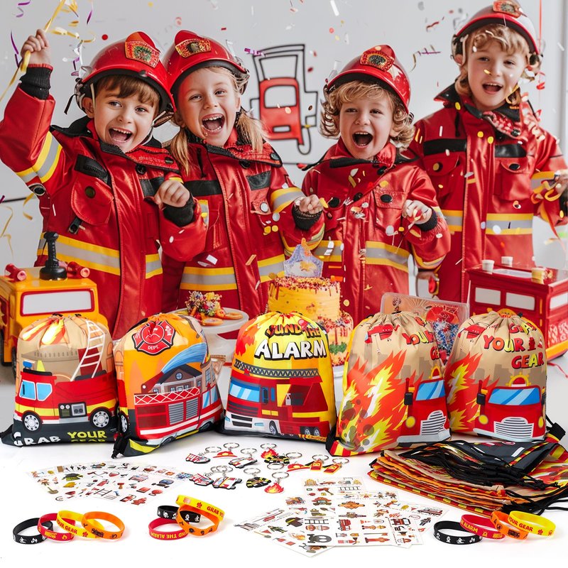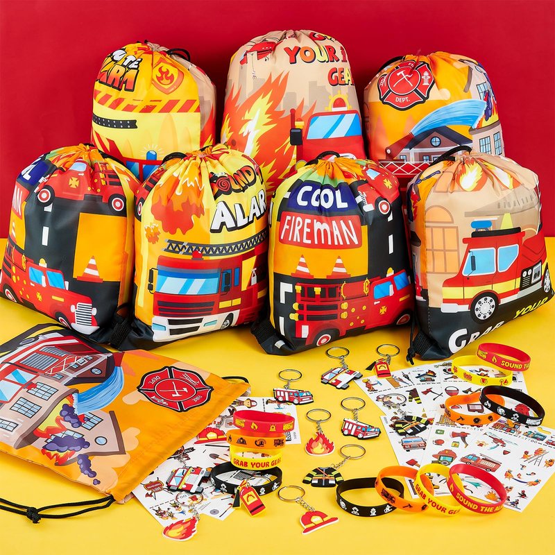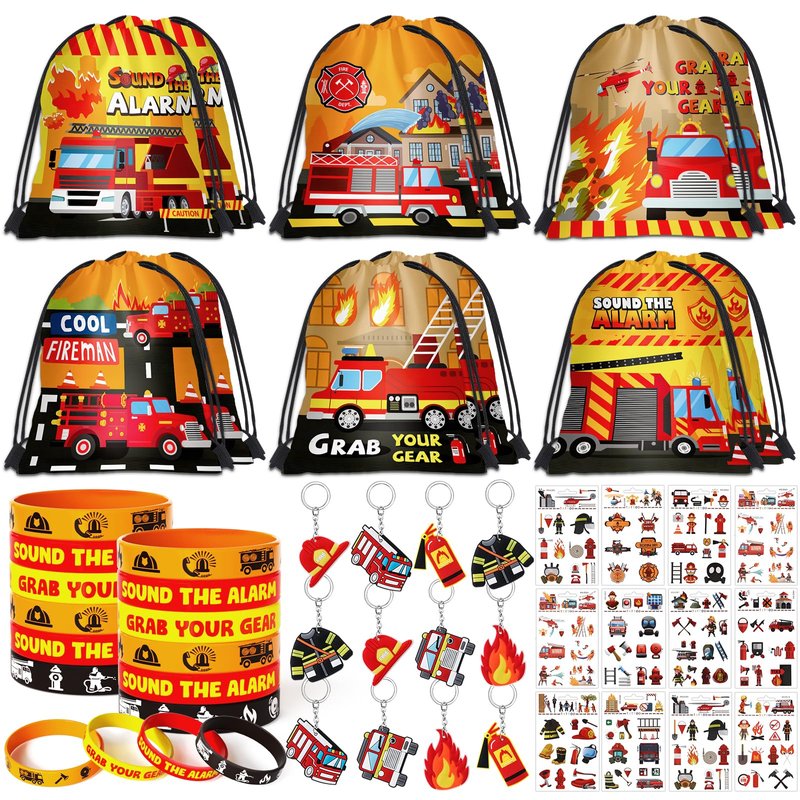 - Excellent Design: All products incorporate firefighter-themed graphics. The drawstring bag can be used as a fire truck birthday gift bag, and 6 different types of fire truck patterns can meet the preferences of every child. Realistic firefighter keychains can be used to decorate children's school bags, interesting tattoo stickers and fashionable silicone bracelets will make the party more joyful. This set of firefighter party supplies will bring more joy to children.