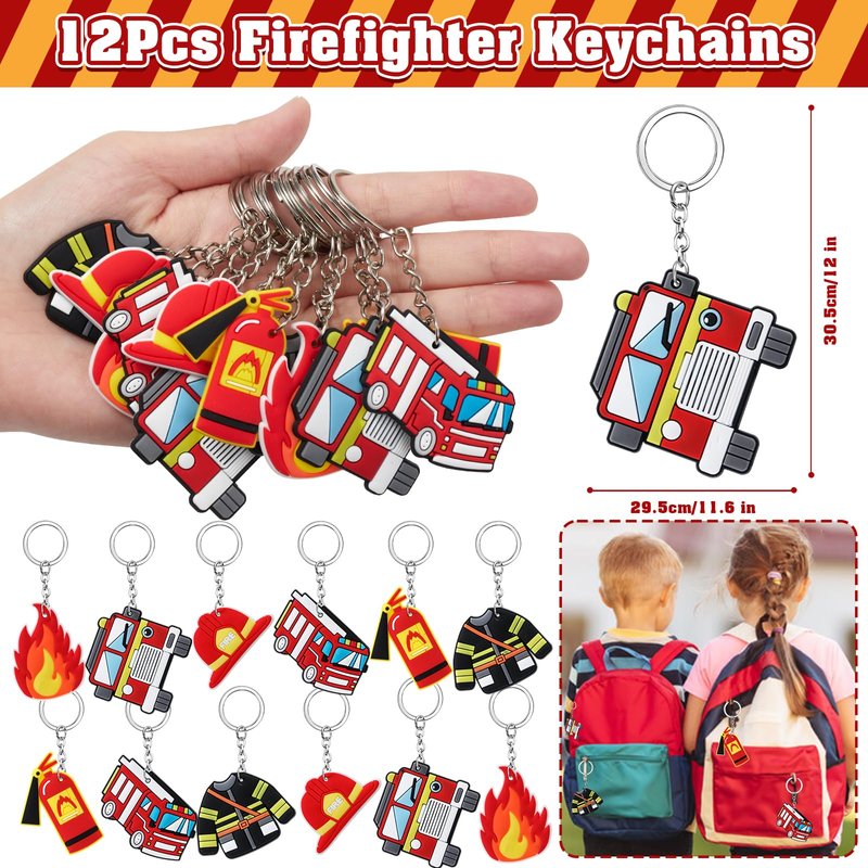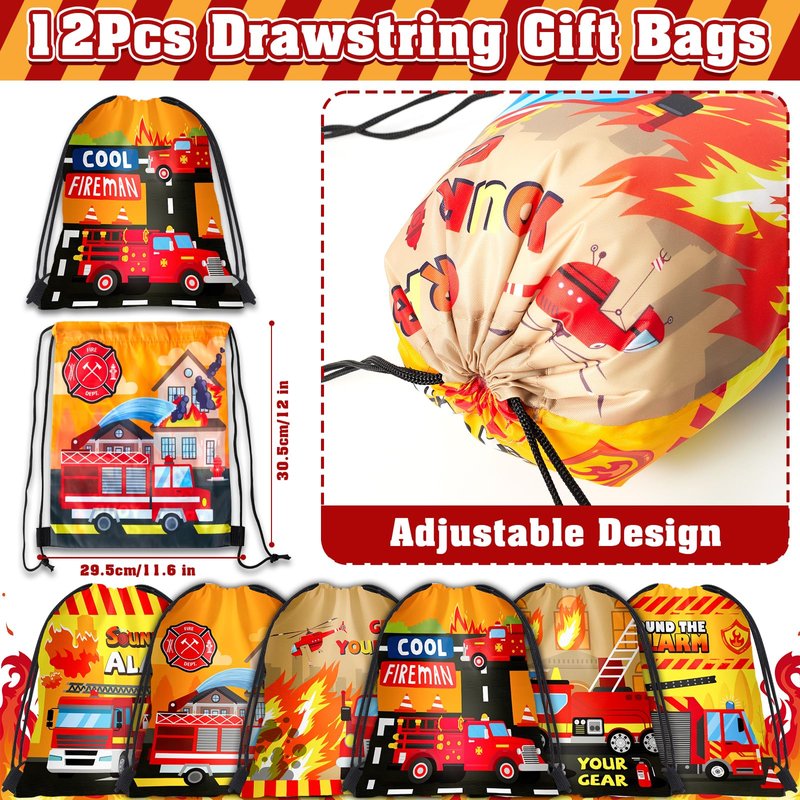 - Firefighter Favors: The set includes 12 fire truck themed drawstring bags (6 styles), 12 firefighter tattoo stickers, 12 firefighter keychains (6 styles), and 12 silicone bracelets (6 styles). Kids will love this rich favor set.